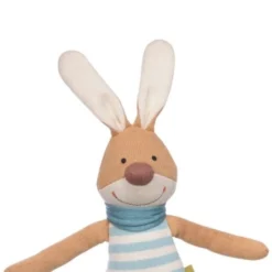 Pour les bébés bio, et dès la naissance, Découverte, confort & réconfort en compagnie de ce Doudou bébé Coton Bio Tino Mousseline Vert d’eau Hoppa®. Un petit lapin doudou amusant doté de 2 oreilles à mâchouiller en éponge, une jolie tête ronde fourrée de fibre de maïs, un long corps de mousseline ocre pour des sensations variées. Un vrai doudou bio pour accompagner et réconforter bébé dans ses premiers moments d’inquiétudes et ses bonheurs. Facile à saisir grâce à sa faible épaisseur, son large corps et ses différents petits appendices (des grandes oreilles à secrets, des petits bouts de pattes tout ronds, faciles à mâchouiller pour apaiser les douleurs dentaires,…) ce doudou Tino en coton bio sera de tous les câlins. Un amusant compagnon qui prendra l’humeur de bébé, et l’accompagnera pour bien débuter dans la vie. Un doudou bébé Hoppa® issu du commerce équitable (certification IFAT: International Fédération for Fair-Trade), et conçu à partir de coton bio (organic c’est à dire, issu de l’agriculture biologique) et de fibre de maïs vierge Bio. Les doudous Hoppa® sont certifiés GOTS, certifiant que tous le processus (de la culture du coton, la production de fibre de maïs, les tricotages, colorations, confections du tissu,….) sont bien biologique (100%). Avec ce doudou, bébé devient défenseur de la nature, de notre environnement, et du travail des hommes….et n’a peur de rien.