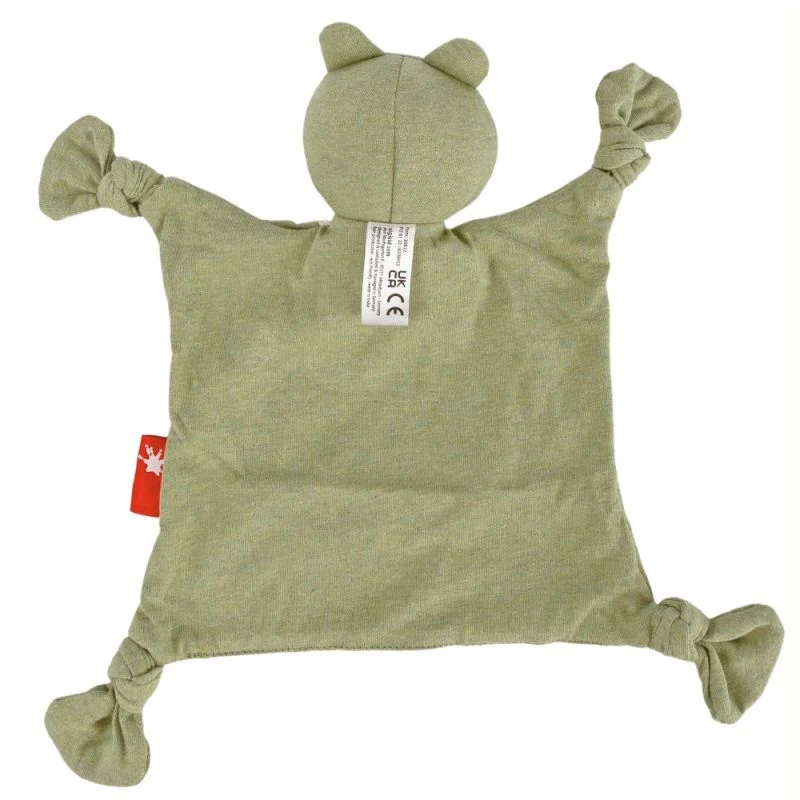 Pour les petits bébés écolo, et dès la naissance, éveil, confort et réconfort en compagnie de ce joli Doudou plat à nœuds Grenouille Jersey de coton bio Sigikid® 26 cm. Un joli doudou plat à nœuds de forme carré avec quatre beaux nœuds aux couleurs Vert chiné et écru. Un doudou plat grenouille avec de grands yeux, un large sourire, de belles joues pour recevoir des bisous et 4 pattes en formes de nœuds pour la saisir, le mâchouiller et mieux le goûter… L’ensemble du doudou Grenouille verte est confectionné en Jersey de coton bio léger, facile à nettoyer, qui conserve facilement les odeurs que bébé affectionne. Le garnissage est en synthétique (100% Polyester) ce qui permet un lavage plus simple et un un séchage plus rapide également. Un doudou grenouille verte avec de grands yeux brodés sympathique pour tenir compagnie à bébé. Un doudou qui ne quittera plus bébé. Protecteur de la nature et défenseur du développement durable, bébé le revendique avec ce joli doudou grenouille verte beau et bio, amusant, protecteur, Chic & écolo. Le tissu coton à la texture douce de notre doudou plat grenouille, apporte des sensations tactiles et visuelles douces et rassurantes.