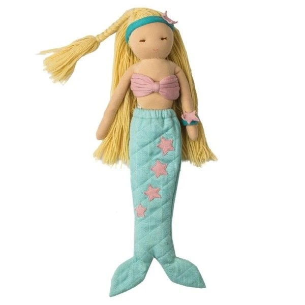 Pour les bébés bio, et dès la naissance, Eveil, confort & réconfort en compagnie de cette jolie Poupée en Tissu Coton Bio Sirène Ava Hoppa® … Issu d’une production équitable cette jolie Poupée de chiffons (poupon) en coton bio et son bébé sont rembourrés à partir fibre recyclée PET. Un doudou Poupée et son bébé bio naturel et propre… Une jolie Poupée de chiffons, une jolie sirène à la longue chevelure blonde, au bustier noyé rose, à la queue turquoise et décoré de quatre étoiles roses tout comme son bracelet et son serre tête étoilé…. Facile à tenir grâce à ses 2 bras bien dessinés, ses multiples petits appendices (queue, mains, tresse) et sa jolie tête, notre poupée de chiffon sera de tous les câlins. Une charmante compagnie pour bien débuter dans la vie, bien accompagné et protégé….